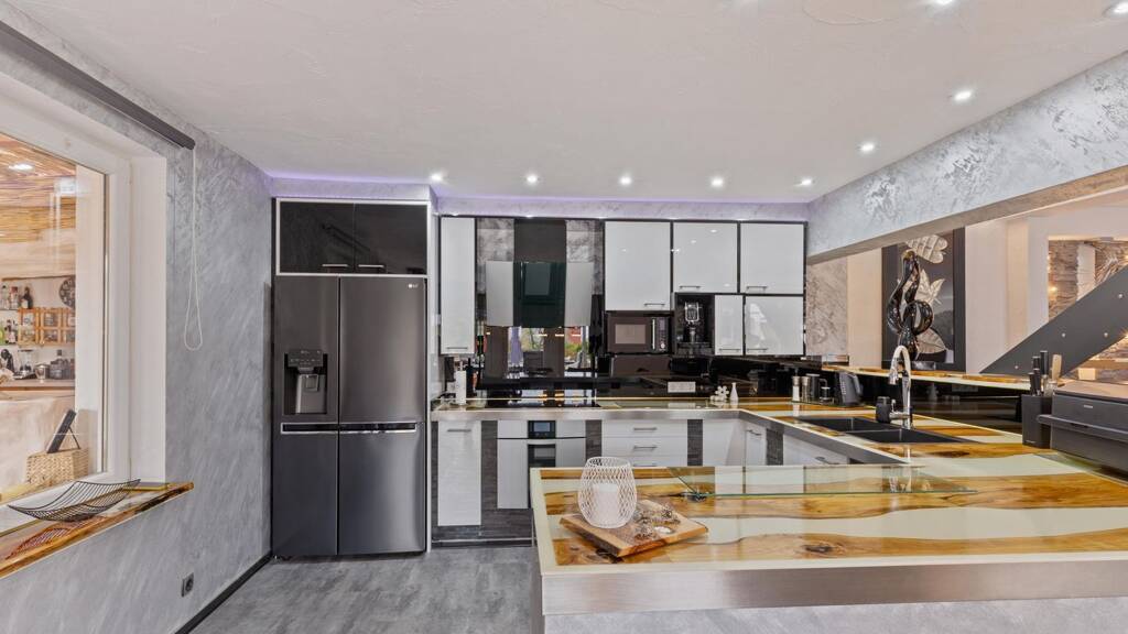 Das Wohnhaus mit ca. 188 m² Wohnfläche wurde 2006 umfassend modernisiert und präsentiert sich in neuwertigem Zustand. Der offene Wohn-, Ess- und Küchenbereich mit hochwertigen Materialien wie Epoxidharz mit Olivenholz, Designheizkörpern und Fußbodenheizung bietet ein Ambiente zum Wohlfühlen auf höchstem Niveau. Ergänzt wird das Erdgeschoss durch ein Gäste-WC, einen Hauswirtschaftsraum und eine großzügige Garderobe.