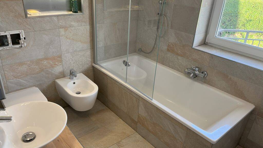 Die Büroeinheit verfügt über 2 getrennte Toiletten und hat außerdem, ein neues modernes Badezimmer mit beigen großformatigen Steingutfliesen ein WC, eine Badewanne mit Dusche, ein Waschbecken und einen Anschluss für eine Waschmaschine.