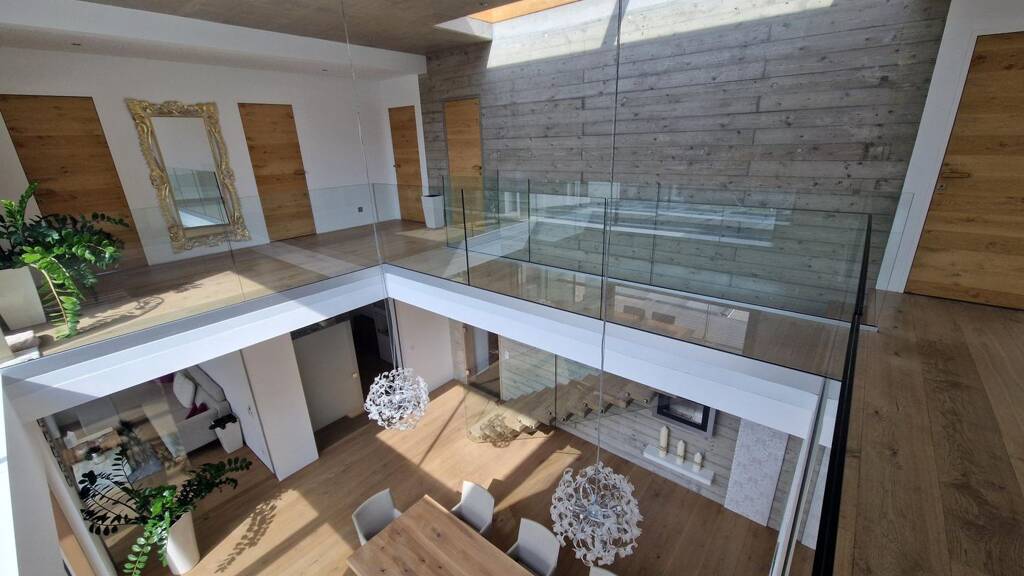 Stilvolle Stiegenanlagen führen in das Obergeschoss, hier werden Sie von einem atemberaubenden Galeriebereich mit viel Glas und toller Belichtung empfangen. Von hier aus sind alle Räumlichkeiten getrennt begehbar, ein Elternschlafzimmer, ein geschmackvolles Badezimmer mit Badewanne, großer Walk-In-Dusche und WC samt Doppelwaschtisch sowie zwei weitere, große Zimmer, welche bei Bedarf mit wenig Aufwand gut teilbar wären, vervollständigen das reichhaltige Platzangebot. Ein Zimmer wird derzeit als Schrankraum genutzt.