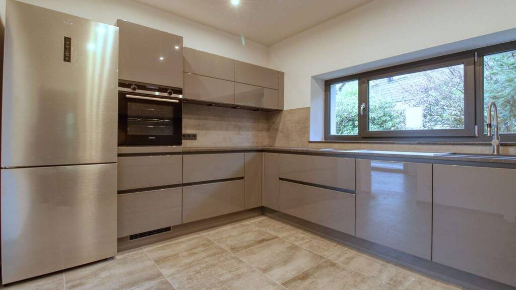 Die moderne Küche mit angrenzendem Hauswirtschaftsbereich präsentiert sich zeitlos und hochwertig ausgestattet. Großzügige Arbeitsflächen, Markengeräte sowie viel Stauraum sorgen für hohen Komfort im Alltag. Ein helles Gäste-Bad ergänzt diese Ebene funktional.
