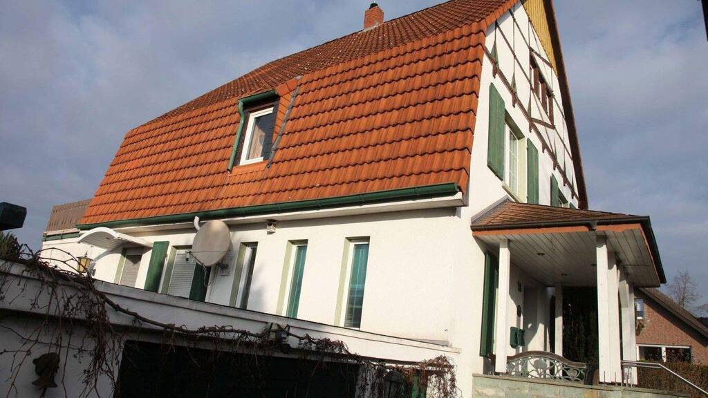 Das Haus präsentiert sich mit einer traditionellen Fachwerkgiebel, einem Mansarddach mit Dachsteinen sowie einem überdachten einladenden Eingangsbereich. Die äußere Erscheinung ist zeitlos und fügt sich harmonisch in die bestehende Nachbarschaft ein.