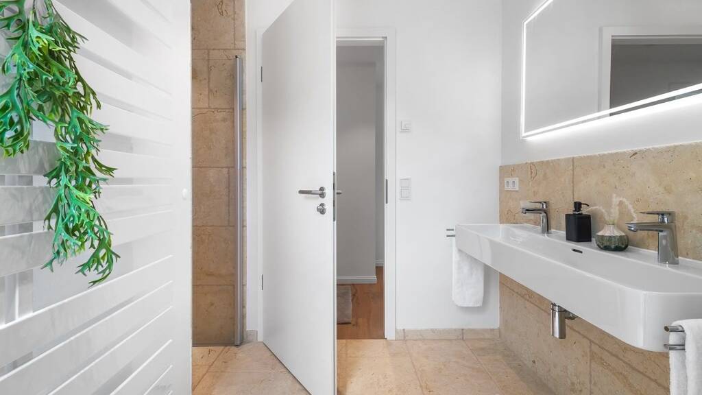 Die Bäder mit Travertinfliesen strahlen Eleganz aus, während die warmen Echtholzfußböden mit Fußbodenheizung ein Gefühl von Behaglichkeit vermitteln.