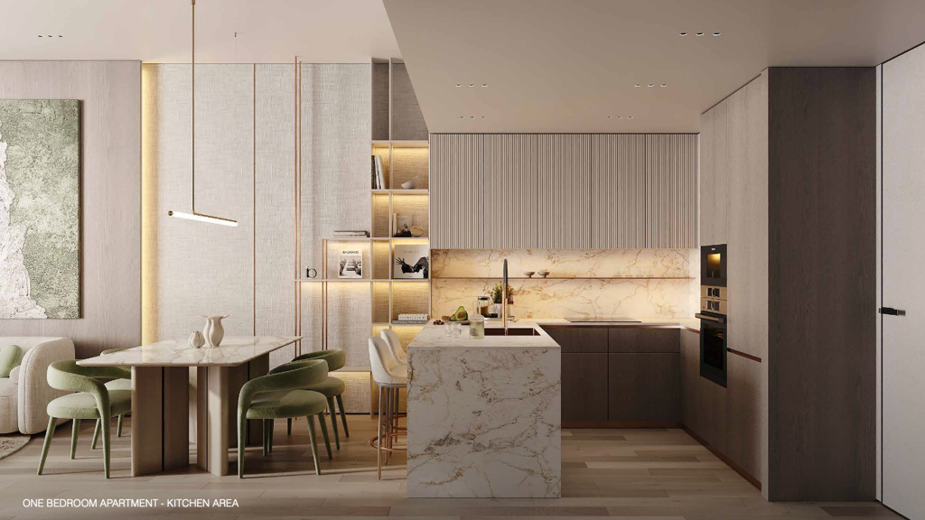 Der Rooftop Infinity Pool mit Skyline-Blick lädt zum Entspannen und Genießen ein. Hier finden Sie Sonnenliegen und Cabana Lounges, um die herrliche Aussicht zu genießen. Das Rooftop Sky Deck und die Panorama-Dachterrasse bieten einmalige Möglichkeiten, die landschaftlich gestalteten Dachgärten zu erkunden. Ruhe- und Relaxzonen im Freien sowie üppige Gartenwege und Grünflächen sorgen für ein idyllisches Ambiente. Das moderne, voll ausgestattete Gym bietet Cardio- und Krafttrainingsbereiche. Die bodentiefen Fenster mit Ausblick schaffen eine Wellness-Atmosphäre für Training und Entspannung. Im exklusiven Residents Clubhouse erwarten Sie Designer-Lounge-Bereiche, eine Bar und Social Counter sowie elegante Aufenthaltsbereiche für Treffen und Arbeiten. Für Familien- und Gemeinschaftszonen stehen Grünflächen für Spaziergänge und ruhige Sitzbereiche im Freien zur Verfügung. Die Promenaden innerhalb der Anlage laden zum Flanieren ein. Die voll möblierten Apartments verfügen über Smart-Home-Systeme für die digitale Steuerung von Licht, Klima und Sicherheit. Hochwertige Küchen, moderne Badezimmer und stilvolle Innenausstattung sorgen für Komfort und Eleganz. Große Balkone und bodentiefe Fenster bieten eine herrliche Aussicht. Die energieeffiziente Bauweise rundet das Gesamtpaket ab.