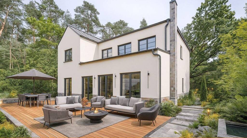 Das weitläufige Grundstück eröffnet außergewöhnliche Entwicklungsmöglichkeiten: Ob japanischer Zen-Garten, Wellness-Oase im Vabali-Stil oder großzügige Poollandschaft - hier lässt sich ein individuelles Refugium gestalten, das Haus und Natur perfekt miteinander verbindet. Die Fertigstellung der Außenanlagen (Terrassen, Garten, Zufahrt) erfordert noch einen Investitionsrahmen von ca. 100.000 bis 150.000 Euro, bietet aber zugleich die Chance zur ganz persönlichen Gestaltung.