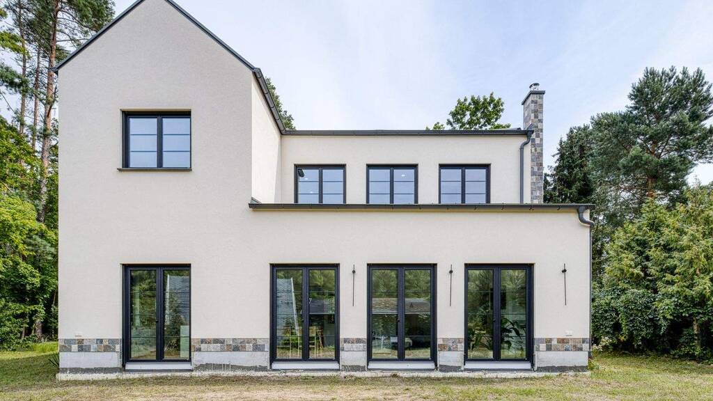 In einer der begehrtesten Wohnlagen am Rande Berlins präsentiert sich diese im Jahr 2022/2023 errichtete Designer-Architektenvilla auf einem rund 2.679 Quadratmeter großen Sonnengrundstück mit idyllischem Wald- und Weitblick.