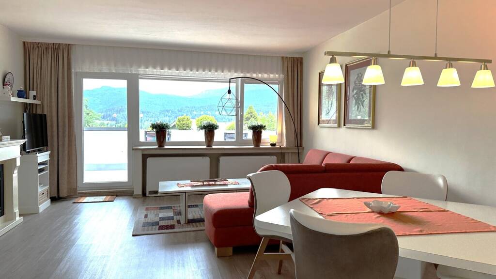 Von der großzügigen und sonnigen Terrasse genießt man einen wunderschönen Blick ins Grüne. Das Ortszentrum ist auch fußläufig in einigen Minuten erreichbar. Der Langlauf-Loipeneinstieg befindet sich auf der anderen Seite der Landstraße und der Bus hält quasi vor der Haustüre.