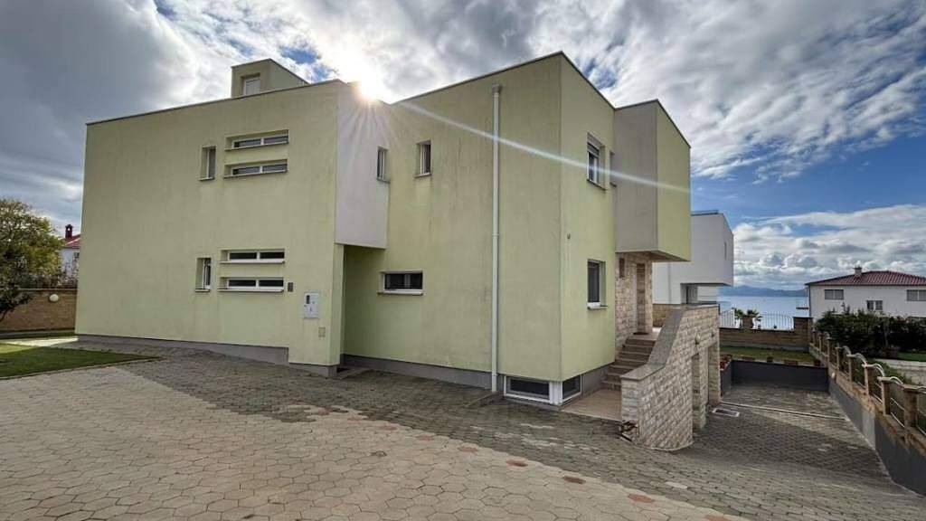 Zadar, Diklo, moderna vila sa apartmanima, prekrasan pogled na more. Villa povrsine 420m2, sagradena na zemljistu od 800 m2, 100 m od mora i plaze. Sastoji se od tri etaze (podrum, prizemlje i kat). - U podrumu se nalaze velika prostorija za druzenje (kuhinja, kamin), garaza, zasebni wc, praonica, susionica, konoba, kotlovnica, stubiste ( 101,88 m2 ); -Na prizemlju se nalazi veliki trosoban stan ( 166,58m2 )koji se sastoji od 3 spavace sobe, kuhinje, prostrane blagavaone ( 23,33 m2), prostranog dnevnog boravka ( 28,49 m2), ostave, kupaonice, wc-a , lode, prostrane terase ( 24,91 m2), stepenica, ulaznog prostora; - Na prvom katu ( 152,48 m2) nalaze se 2 odvojena stana, jedan jednosoban, drugi dvosoban, te zasebno dvije sobe s vlastitim kupaonicama. U dvoristu nalazi se velika natkrivena ljetna kuhinja s kominom i kupaonicom. Lijepo uredena okucnica, sa mnogo zelenila, kamena, sa otvorenim pogledom na more. Iz svake prostorije se pruza pogled na more. Kuca je smjestena na lijepoj lokaciji 100 m od mora i plaze, u okruzenju vila sa bazenima, te lijepo uredenih okucnica. Pogodno za bavljenje turizmom. Vise informacija na upit. Trazena cijena je 1.200.000 EURA.