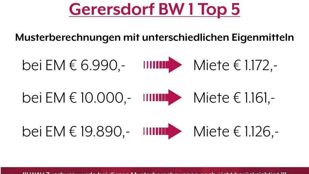 *Die regulären Eigenmittel für diese Wohneinheit betragen aktuell 19.890,-. Eine Reduktion auf mindestens 6.990,- ist auf Wunsch möglich. Natürlich sind auch höhere Beträge möglich. Bei höheren Eigenmitteln (als die Mindestbeträge) verringert sich die monatliche Miete. Beispiele dazu finden Sie am Foto: Musterberechnungen mit unterschiedlichen Eigenmitteln