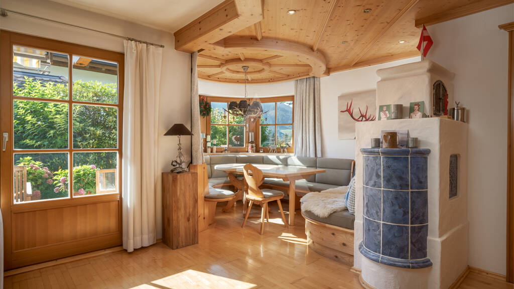 Im Erdgeschoss erwartet Sie ein einladender Wohnbereich mit einer gemütlichen Sitzecke sowie einem traditionellen Kachelofen. Von hier aus haben Sie Zugang zur Terrasse und in den ca. 264 m² großen Garten. Hier können Sie den Blick auf angrenzende Wiesenflächen und die gesamte Kaiserfront in vollen Zügen genießen. Ebenso erwartet Sie im Erdgeschoss ein Koch-/Essbereich, ein Gästeschlafzimmer mit Bad und Ankleide, ein separates Gäste-WC und ein Wirtschaftsraum.