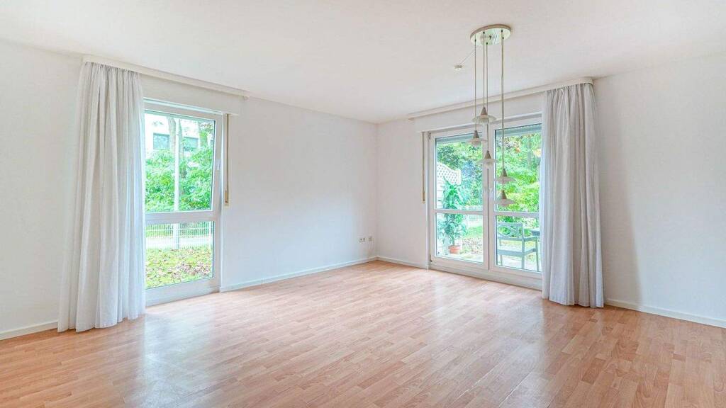Der Eingangsbereich öffnet sich in einen hellen Wohnraum, der durch seine klare Struktur und große Fensterflächen ein angenehmes Raumgefühl vermittelt. Der Zugang zur rückwärtig gelegenen Terrasse erweitert den Wohnbereich ins Grüne - ein idealer Ort für den morgendlichen Kaffee oder entspannte Abendstunden im Freien. Die Küche ist dezent und funktional in das Raumkonzept eingebunden, Fliesen in Küche, Bad und Flur unterstreichen die pflegeleichte Ausstattung, während der Wohnraum mit warmem Laminat ausgelegt ist.