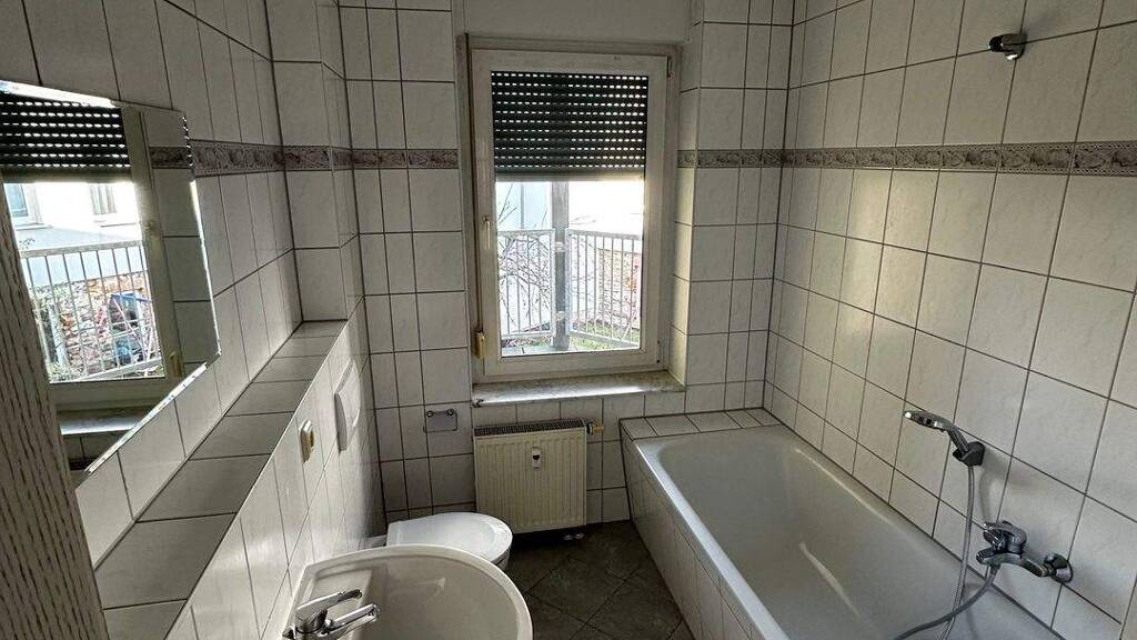 2-Zimmer-Wohnung im 1. OG: - Tageslichtbad mit Wanne - Flur, Küche und Bad sind Wandhoch gefliest - Balkon in Richtung S/W - Vinyl-Laminat Fußboden in Schlaf- und Wohnzimmer - Einbauküche mit Geschirrspüler, Kühlschrank, Herd, Dunstabzugshaube und mehreren Ober- und Unterschränken zu übernehmen( VB) - Mieterkeller abschliebar - Waschmaschinenraum im Keller zur Nutzung
