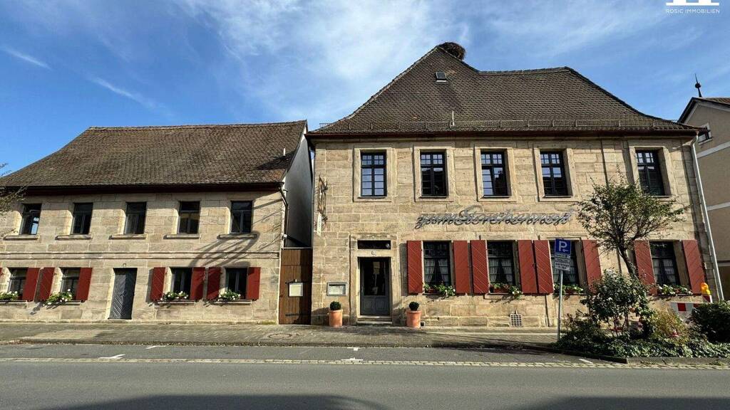 Das traditionsreiche "Zum Storchennest" in Baiersdorf (Hauptstraße 39-41) ist weit mehr als nur eine Gastronomiefläche - es ist eine echte Institution und seit über zwei Jahrhunderten fester Bestandteil des Stadtbildes. Das repräsentative, ursprünglich Ende des 18. Jahrhunderts errichtete Gebäude begeistert mit seiner markanten Sandsteinfassade und charmanten Fachwerkelementen - ein unverwechselbarer Auftritt mit Charakter, der sofort Atmosphäre und Vertrauen vermittelt.