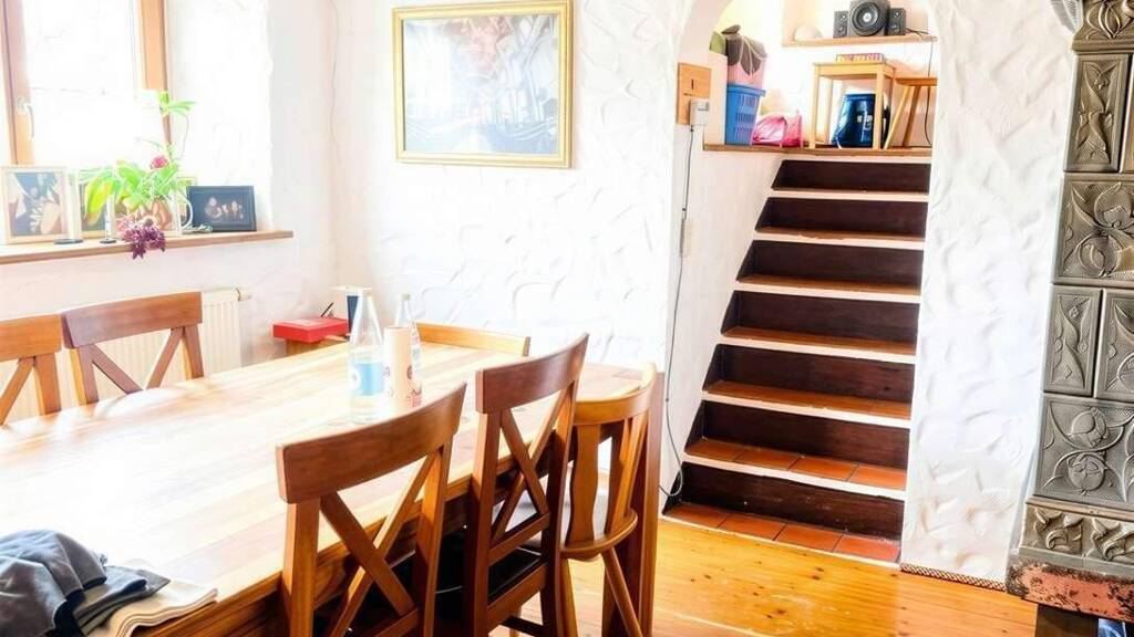 Dieses liebevoll sanierte ehemalige Bauernhaus verbindet historischen Charme mit modernem Wohnkomfort. Der einladende Eingangsbereich führt in ein großzügiges Esszimmer mit Kachelofen und moderner Küche samt zusätzlichem Holzherd. Das helle Wohnzimmer mit Panoramafenster bietet einen schönen Blick in den Garten und öffnet sich nach oben zum Galerieschlafzimmer.