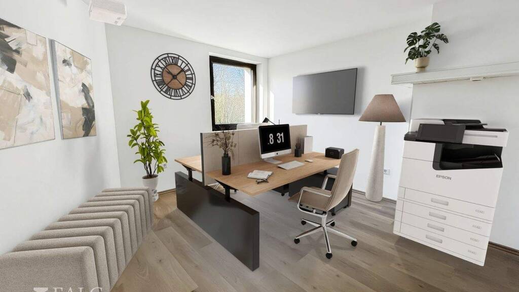 Beim Betreten der Bürofläche gelangen Sie in einen geräumigen Flur, der sich ideal als Empfangsbereich oder Wartezone für Kunden und Geschäftspartner eignet. Linkerhand befinden sich drei helle Büroräume, die sich hervorragend als Einzel- oder Teambüros nutzen lassen. Zudem gibt es hier ein modernes Badezimmer, das für Mitarbeiter und Besucher gleichermaßen praktisch ist. Rechterhand führt der Flur zu einer weiteren großzügigen Bürofläche, die sich ideal als Konferenzraum oder zusätzliches Arbeitszimmer eignet. Direkt daneben befindet sich eine geräumige Küche, die den perfekten Ort für entspannte Pausen und gemeinsame Mahlzeiten bietet.