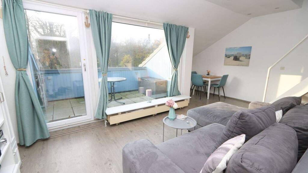 Vom Wohnbereich aus führt der Zugang auf den Süd-Balkon, der einen wunderschönen Blick ins Grüne und über die Dächer von Grömitz bietet - ideal für entspannte Stunden an der frischen Luft.