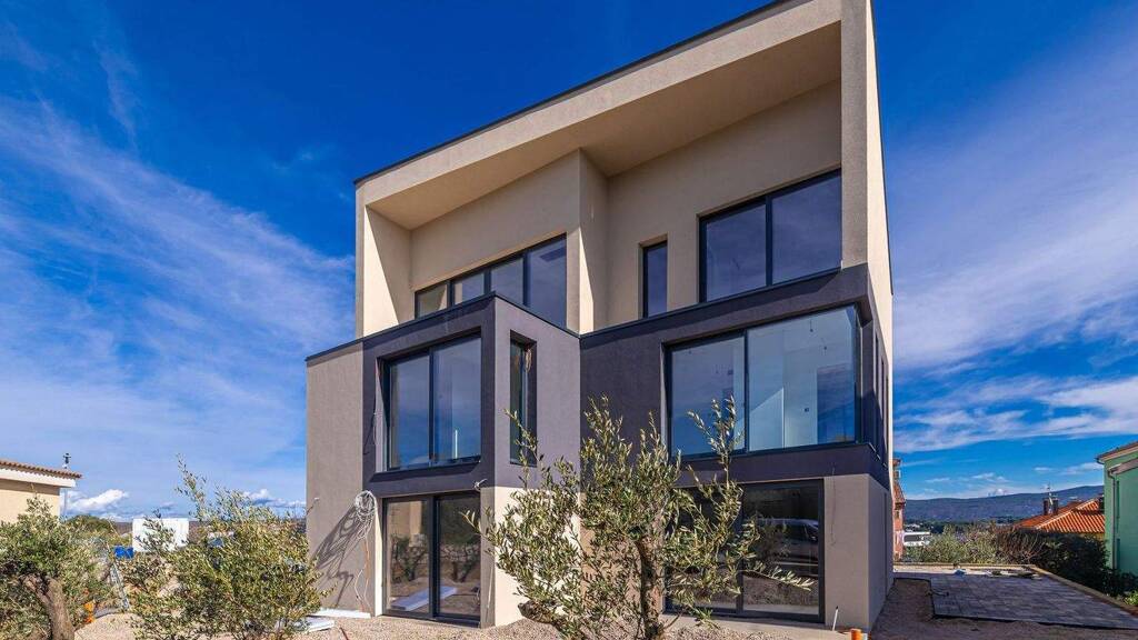 Aluminium-Außenfenster mit Dreifachverglasung und elektrische Brisolej-Lamellen mit Sensoren tragen zur Energieeffizienz und zum Schutz vor Überhitzung bei. Der Innenbereich wird durch moderne Fenster und Türen mit rahmenlosen Türrahmen sowie hochwertige Keramik- und Parkettböden ergänzt.