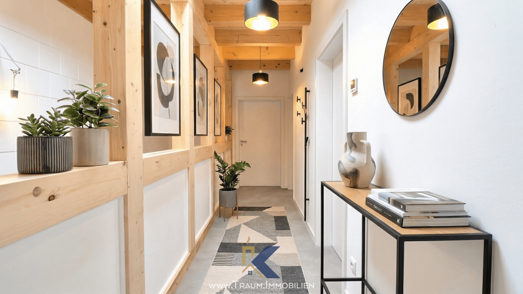 Von dem mit Holzbalken ausgeschmückten Flur, kommen Sie in drei separate Zimmer. Diese Räume lassen sich flexibel nutzen - ob als gemütliches Schlafzimmer, stilvolles Homeoffice oder liebevoll gestaltetes Kinderzimmer. Dank der großzügigen Grundrisse bieten sie ausreichend Platz für individuelle Einrichtungsideen und schaffen eine angenehme Wohnatmosphäre. Große Fenster sorgen für viel Tageslicht und ein freundliches Ambiente, während die hochwertige Ausstattung den modernen Wohnkomfort unterstreicht.