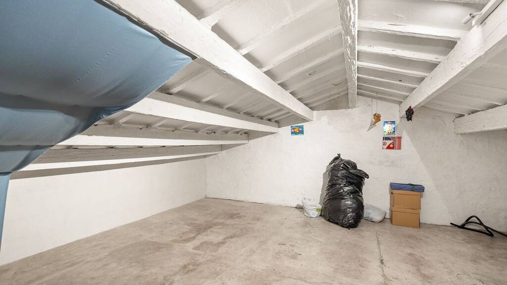 Das Haus verteilt sich auf einen Wohnbereich, einer Küche mit überdachter Terrasse und einer Treppe, die hinunter in den ca. 100 qm großen Garten führt. Von dort geland man in das bewohnbare Untergeschoss mit Gewölbedecke.