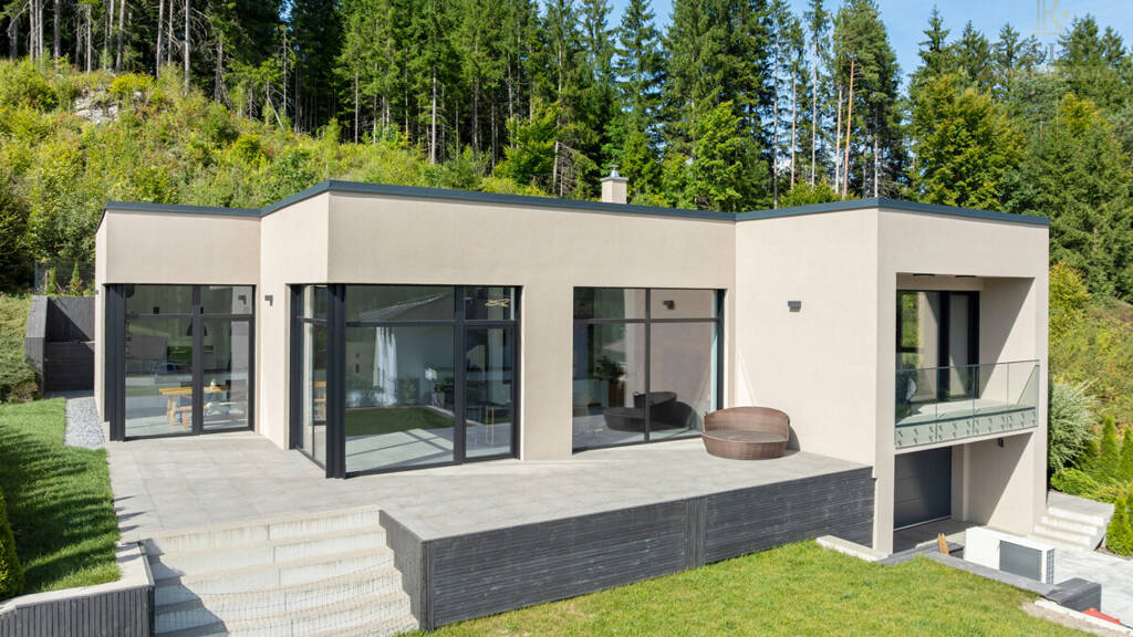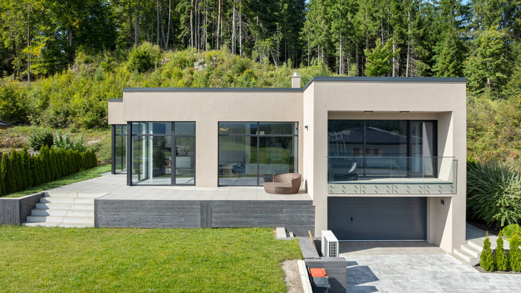 Dieses exklusive Architektenhaus auf einer Wohnebene vereint modernes Design, hochwertige Ausstattung und lichtdurchflutete Panoramafensterfronten.