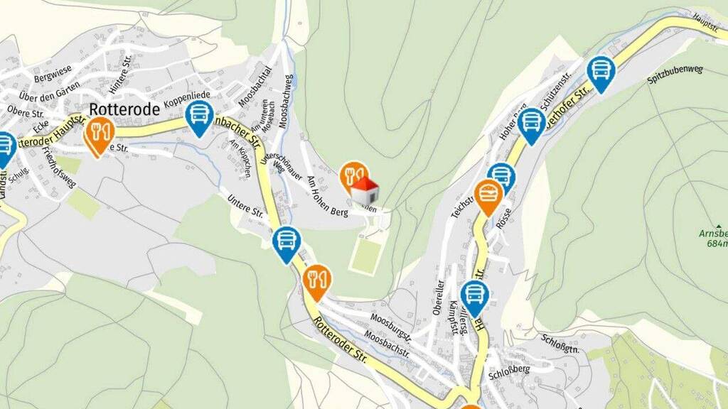 Rotterode bietet eine naturbelassene Umgebung mit ausgedehnten Wander- und Radwegen, die besonders Aktivurlauber und Erholungssuchende ansprechen. Gleichzeitig ist der Ort gut angebunden: Einkaufsmöglichkeiten und Basisdienstleistungen sind in wenigen Minuten erreichbar, eine Bushaltestelle befindet sich fußläufig im Ortsbereich und sichert einen flexiblen Anschluss an den öffentlichen Nahverkehr.