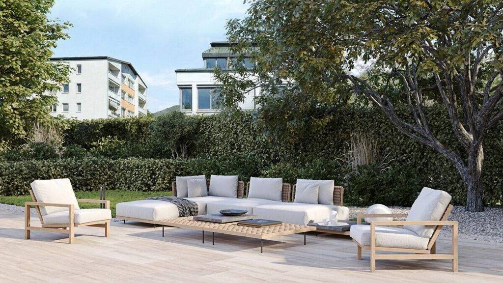 Das Herzstück der Wohnung bildet der großzügige offene Wohn- und Essbereich. Große Fensterflächen sorgen für ein helles, freundliches Ambiente und schaffen eine einladende Atmosphäre für gesellige Stunden mit Familie und Freunden. Von hier aus eröffnen sich gleich drei Zugänge auf die beeindruckende rund 100 m² große Terrasse sowie in den ca. 240 m² umfassenden Privatgarten - eine traumhafte Kombination, die das Wohnen ins Freie erweitert und eine private, grüne Oase in ruhiger Umgebung schafft.