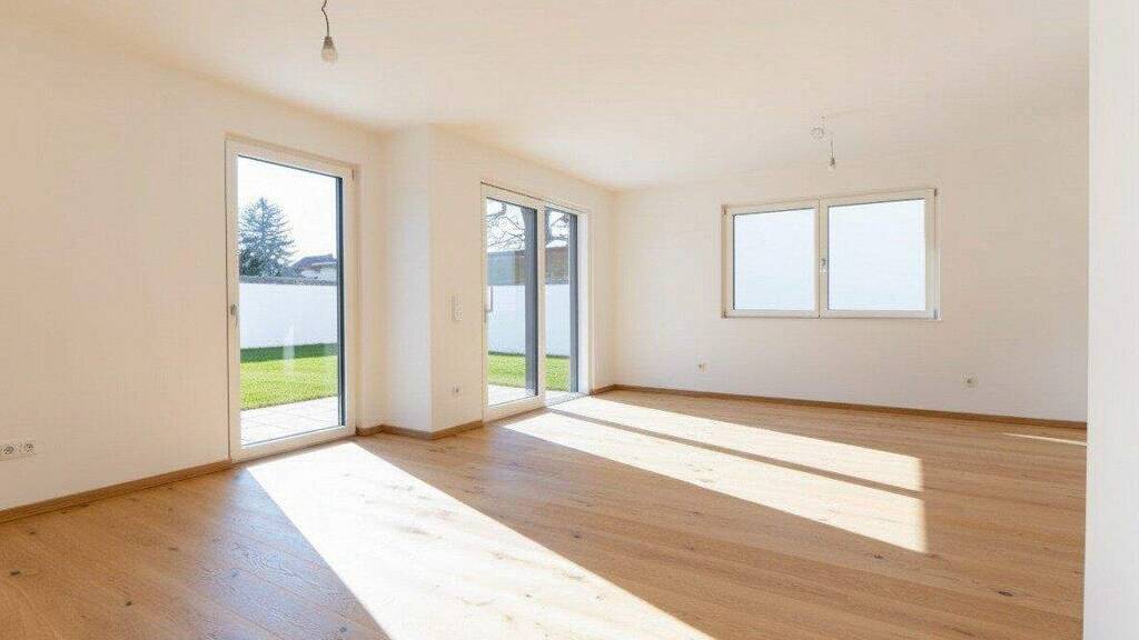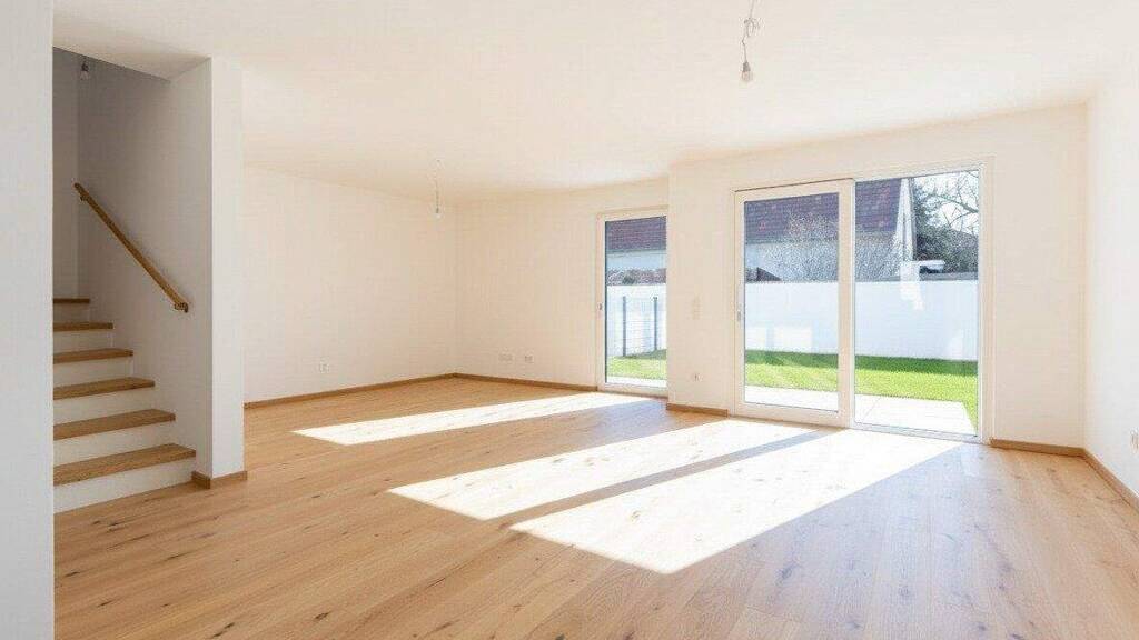 Beim Eintreten öffnet sich ein einladender Vorraum, der ausreichend Platz für eine Garderobe bietet. Auf dieser Ebene befindet sich zudem ein Gäste-WC, ausgestattet mit Dusche und Waschbecken - eine praktische Ergänzung für Besucher und den Alltag. Ein separater Abstellraum sorgt für Ordnung und schafft wertvollen Stauraum. Von der freundlich hellen Wohnküche, die mit ihrem durchdachten Schnitt und den großen Fensterflächen eine lichtdurchflutete Atmosphäre erzeugt, gelangt man unmittelbar auf die Terrasse und in den Garten.