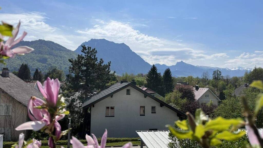Sowohl vom Wohnzimmer als auch vom Elternschlafzimmer aus gelangt man auf die Terrasse und in den eigenen Garten. Von hier genießt man einen wunderbaren Ausblick auf den Traunstein und die umliegende Bergwelt.