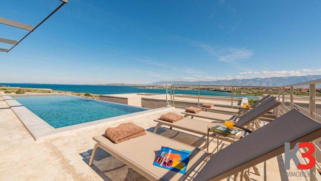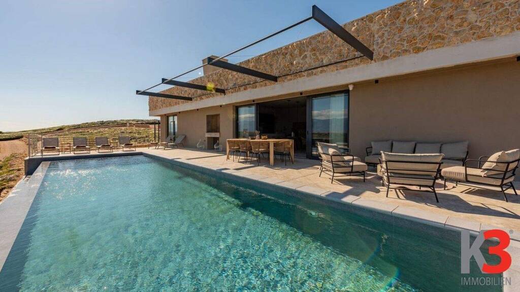 Zum Verkauf: Moderne Luxusvilla mit atemberaubendem Meerblick in Povljana auf der Insel Pag. Diese luxuriöse Imilie wurde 2024 erbaut und liegt nur 400 Meter vom Meer entfernt. Das Haus zeichnet sich durch einen modernen Baustil mit dominanten Betonelementen aus. Es verfügt über 193 m² Wohnfläche, die sich auf einer einzigen Etage befinden, und liegt auf einem 780 m² großen Grundstück. Das geräumige Wohnzimmer ist mit einer voll ausgestatteten Küche verbunden und führt durch Glaswände auf eine große Terrasse. Auf der Terrasse befindet sich ein Außenpool mit herrlichem Meerblick. Darüber hinaus bietet das Haus vier Schlafzimmer mit jeweils eigenem Badezimmer und Platz für bis zu acht Personen. Parkplätze sind auf dem Grundstück vorhanden, einschließlich einer Ladestation für Elektroautos.