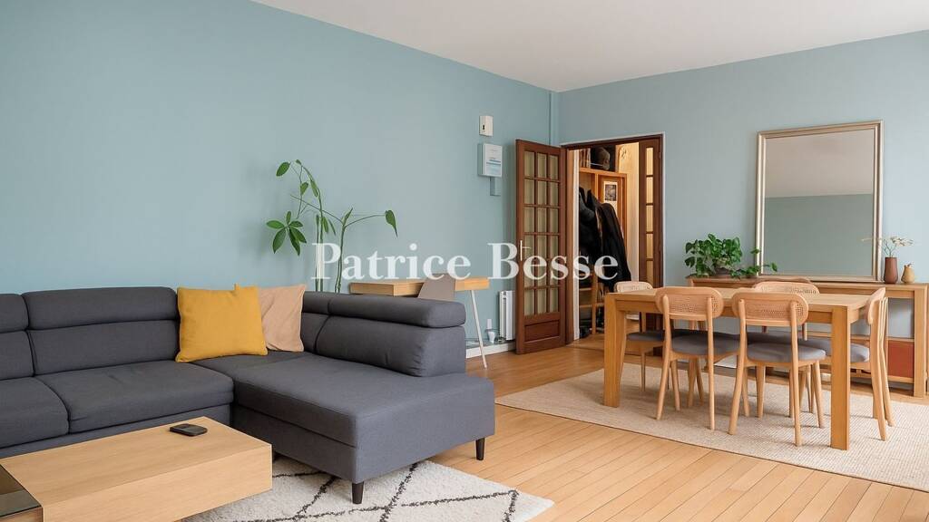 From the foyer, glass double doors provide access to a living room and a dining room, of approximately 25 m², with hardwood floors and a floor-to-ceiling height of 2.8 metres, whereas a perpendicular hallway leads to a bathroom with a bathtub and a washbasin, as well as two bedrooms with hardwood floors, which measure approximately 10 m² and 15 m², respectively. In addition, the flat is sold with a cellar, but does require some light remodelling, such as reconfiguring the kitchen's layout and renovating the bathroom. Featuring double-glazed windows throughout, if two walls in one of the bedrooms are insulated, the flat will be able to boost its energy efficiency rating from an E to a D.