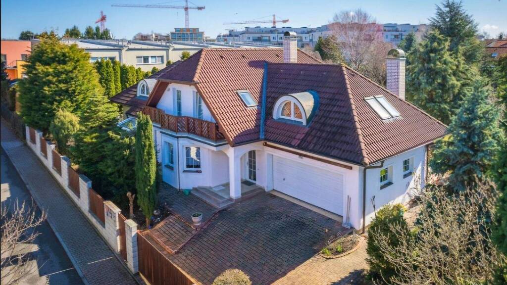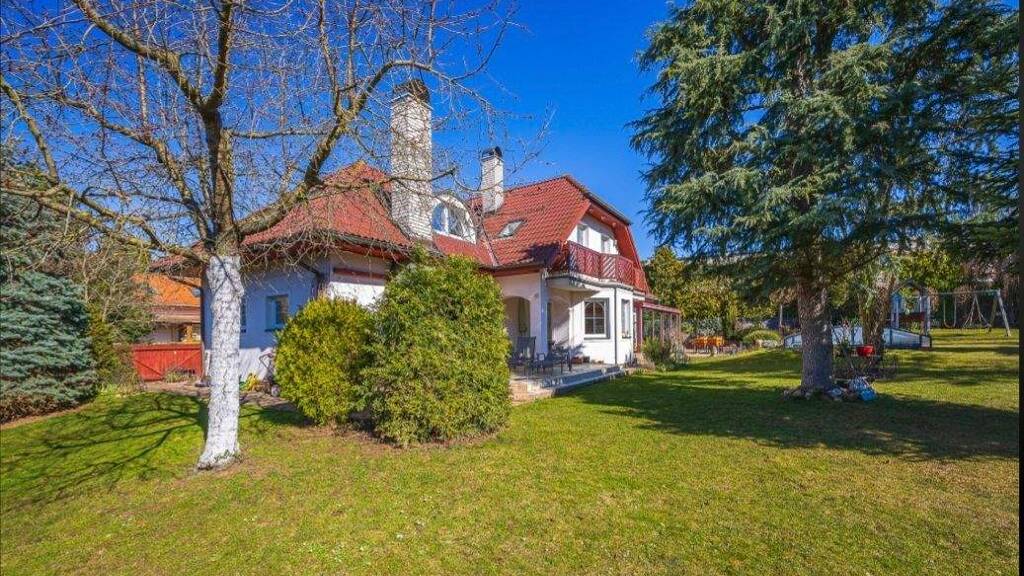 Das ursprüngliche Kaiserhaus der Central Group aus dem Jahr 2002 wurde 2007 um einen Anbau mit Untergeschoss erweitert. Ziel der Erweiterung war die Vergrößerung des Wohnbereichs im ersten Obergeschoss mit einem geräumigen Wohnzimmer und einem Wintergarten, der direkt an die neue Terrasse und den Garten angrenzt. Dadurch entstand eine einzigartige Verbindung zwischen Innen- und Außenbereich. Der neue Anbau umfasst außerdem einen Haupteingang mit einem größeren Vorraum. Der ursprüngliche Eingang blieb als Nebeneingang erhalten und dient hauptsächlich der direkten Küchenversorgung. Der gesamte Anbau verfügt über ein Untergeschoss, in dem sich im ersten Obergeschoss ein Akustikstudio befindet. Dieses ist in drei Räume unterteilt: einen darüberliegenden Raum und zwei separate, akustisch getrennte Aufnahmeräume, von denen einer vollständig gedämpft ist und keine Nachhallzeit aufweist. Im Untergeschoss befindet sich außerdem ein Abstellraum. Das zweite Obergeschoss entspricht dem ursprünglichen Teil des Hauses. Die Raumaufteilung beträgt insgesamt 11+kk. Im ersten Obergeschoss befinden sich zwei Windfänge, eine Küchenzeile, ein Esszimmer, ein Wohnzimmer mit Wintergarten (55 m²) und ein Gästezimmer. Im zweiten Obergeschoss befinden sich zwei Büros, zwei Schlafzimmer und ein Kinderzimmer. Die Räume im zweiten Obergeschoss sind mit Klimaanlagen ausgestattet, die auch im Wärmepumpenmodus betrieben werden können und so ganzjährig für angenehme Temperaturen sorgen. Das Gebäude verfügt über insgesamt vier Badezimmer mit WC, wobei das Hauptbadezimmer im zweiten Obergeschoss neben einer Dusche auch eine Eckbadewanne mit Massagefunktion bietet. Die Oberflächen im Haus sind aus Holz und italienischen Fliesen gefertigt. Die Fliesen sind italienischer Herkunft, und die Einrichtung ist hochwertig. Die Wohnfläche beträgt 235 m², die nutzbare Fläche 417 m² zuzüglich 92 m² Balkone und Terrassen, insgesamt also 506 m². Ausrichtung: Südosten/Nordwesten. Das gesamte Haus ist aus Ziegeln gebaut, teilweise unterkellert. Die Außenwände bestehen aus 36,5 und 24 cm dicken, thermogeformten Paneelen. Der Anbau ist zusätzlich mit einer 10 cm dicken Dämmung versehen. Alle Trennwände sind aus Ziegeln. Das Haus verfügt über zwei Schornsteine: einen für den Kaminofen im Esszimmer und einen für den Grillplatz auf der Terrasse. Die Beheizung erfolgt über zwei unabhängige Systeme. Im ursprünglichen Haus im Imperial-Stil gibt es eine Zentralheizung und eine Warmwasserheizung mit Gasboiler. Im Anbau sorgt eine elektrische Fußbodenheizung für angenehmes Wasser. Die Energiekosten belaufen sich auf ca. 12.000 CZK pro Monat. Das Dach ist ein Holzdachstuhl mit Bramac-Ziegeln. Im Erdgeschoss befindet sich eine geräumige Doppelgarage. Die Zufahrt mit zusätzlichen Stellplätzen für 3-4 Autos und die Wege rund ums Haus sind mit Verbundpflastersteinen gepflastert. Im ersten Stock befindet sich das etablierte Tonstudio Redbell.cz, das hauptsächlich Hörbücher für die Verlage und Vertriebsfirmen Audiolibrix, Audiotéka, Albatros und andere produziert. Die Studioräume sind schallisoliert (50 dB) und die Glasscheiben sind mit Doppelverglasung und Dämmgas gefüllt. Wasser-, Abwasser-, Gas- und Stromanschluss sind öffentlich. Ein Rückhaltebecken mit ausreichend Wasser dient der Gartenbewässerung. Das Haus verfügt über zwei Telefonanschlüsse (einen VDSL-Anschluss, der zweite ist noch nicht aktiv), zwei 5G-Internetanschlüsse (ca. 40 Mbit/s), WLAN (2,4 GHz und 5 GHz), das alle Räume inklusive des Studios abdeckt, sowie ein Sicherheits- und Kamerasystem mit Aufzeichnungen von über einem Monat und eine Alarmanlage. Fernsehen, inklusive Satellitenfernsehen, ist in fast allen Räumen möglich.