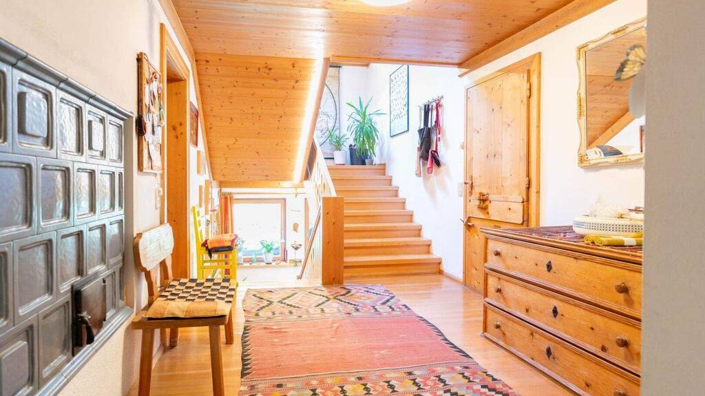 Im Erdgeschoss empfängt Sie ein gemütlicher Wohnraum mit traditionellem Kachelofen, der für behagliche Wärme sorgt. Die angrenzende Küche mit Speisekammer bietet ausreichend Platz für kulinarische Entfaltungen. Ein separates Büro ermöglicht konzentriertes Arbeiten.