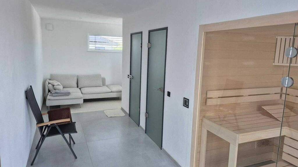Entdecken Sie dieses ca. 244 m² große Einfamilienhaus im eleganten Bauhausstil, das modernes Design mit Top-Technik vereint. Das Anfang 2023 massiv erbaute Haus bietet ein durchdachtes Wohnkonzept für die ganze Familie. Im Erdgeschoss erwartet Sie ein ca. 60 m² großer offener Wohn- und Essbereich mit separater Küche. 2 Schlafzimmer, ein modernes Bad mit begehbarer Dusche und ein Hauswirtschaftsraum mit Zugang zur Doppelgarage runden das Raumangebot ab. Im Obergeschoss finden Sie zwei Schlafzimmer, eine Galerie sowie einen Wellnessbereich mit Sauna, Dusche und WC. Von hier aus gelangen Sie direkt auf die ca. 35 m² große Dachterrasse mit Weitsicht. Das 700 m² große Grundstück verfügt über eine teilweise überdachte Terrasse (12 x 3,5 m), einen Garten mit Rasenfläche und Werkzeugschuppen. Die ca. 40 m² große Doppelgarage mit Starkstromanschluss sowie drei Außenstellplätze bieten großzügige Parkmöglichkeiten.