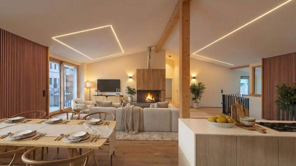 Der barrierefreie Zugang über den Lift, der direkt in die Wohnung führt, vermittelt bereits beim Betreten ein Gefühl von Komfort und Privatsphäre. Der großzügige Wohn- und Essbereich überzeugt mit beeindruckender Raumhöhe, einem eleganten Kaminanschluss und einer hochwertigen, vollständig integrierten Küche. Großzügige Fensterflächen lassen viel Tageslicht einströmen und erzeugen ein angenehmes lichtdurchflutetes Wohnklima.