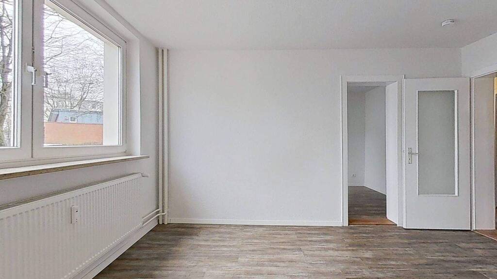 Auch das Schlafzimmer bietet viel Platz zur individuellen Gestaltung. Ein Boden in Holzoptik, der sich auch im Wohn- und Esszimmer sowie dem Flur befindet, verleiht dem Raum eine warme Atmosphäre.