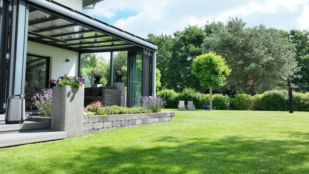 Der großzügige voll verglaste Sommergarten mit 50 qm bietet bereits am Frühjahr die Möglichkeit geschützt inmitten der Natur zu leben. Dieser ist als Wohnraum von März bis weit in den Oktober bei Sonnentagen voll nutzbar. Je nach Wetterlage lässt sich dieser ganz oder teilweise noch vorne öffnen und ist mit zwei elektrischen Markisen, auch online steuerbar, versehen.