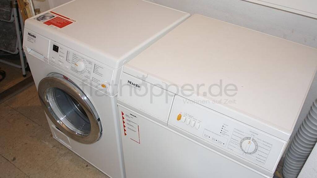 Eine Waschmaschine und Trockner befindet sich im Haus.