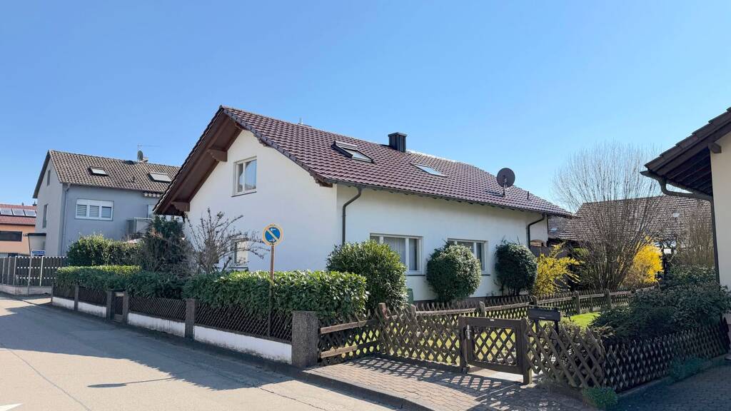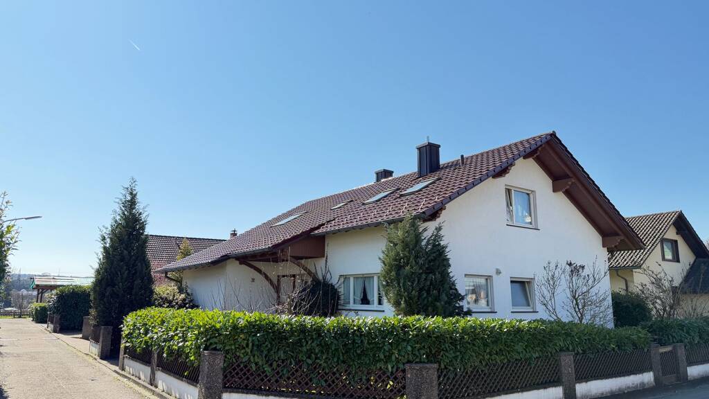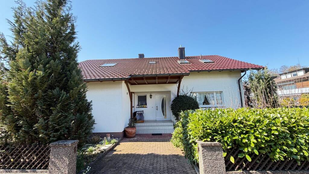 Das freistehende Einfamilienhaus mit Einliegerwohnung im Dachgeschoss überzeugt bereits beim Ankommen durch seinen liebevoll gestalteten Vorgarten sowie den großzügigen, überdachten Eingangsbereich, der ein besonders einladendes Wohnambiente schafft. Die charmante Immobilie wurde 1964 errichtet und in den 1970er-Jahren durch einen Anbau (Büro) sowie eine großzügige Terrasse mit darunterliegendem Garagenraum erweitert. Das Haus wurde von den Eigentümern stets gepflegt und instand gehalten; zuletzt erfolgte 2009 eine umfassende Dachsanierung. Die Wohnfläche von ca. 155 m² verteilt sich auf zwei Ebenen. Im Erdgeschoss befindet sich die etwa 90 m² große Hauptwohnung mit direktem Zugang zur großzügigen Terrasse. Vom geräumigen Flur eröffnet sich der Blick in den lichtdurchfluteten Wohn- und Essbereich – das Herzstück des Hauses. Ein behaglicher Kachelofen mit umlaufender Sitzbank sorgt hier für eine angenehme Atmosphäre, während der direkte Zugang zur Terrasse und in den weitläufigen Gartenbereich zusätzlichen Wohnkomfort bietet. Auf dieser Etage stehen außerdem ein großes Schlafzimmer, ein praktisches Büro, ein modernisiertes Tageslichtbad mit Dusche, WC und Waschbecken sowie eine geräumige Wohnküche mit Einbauküche und Platz für einen großen Esstisch zur Verfügung. Ein besonderes Highlight ist die Terrasse, die viel Privatsphäre bietet und zum Entspannen, Frühstücken oder geselligen Beisammensein einlädt. Über das zentrale Treppenhaus gelangen Sie in das ausgebaute Dachgeschoss, das aktuell als Einliegerwohnung genutzt wird. Hier erwarten Sie zwei großzügige Zimmer, zwei kleinere Tageslichtbäder (ursprünglich ein Bad), eine Teeküche sowie ein überdachter Balkon mit schönem Blick in den Garten. Diese Etage eignet sich ideal als separater Wohnbereich für Kinder oder Gäste und kann im Rahmen zukünftiger Modernisierungen problemlos in die Hauptwohnung integriert werden. Das Untergeschoss ergänzt das Raumangebot mit einem Heizraum, einer Waschküche, zwei geräumigen Vorratskellern sowie dem Zugang zur innenliegenden Garage. Diese bietet Platz für ein Fahrzeug und zusätzlichen Stauraum, beispielsweise für Fahrräder oder Gartengeräte. Der großzügige und geschmackvoll angelegte Garten eröffnet vielfältige Gestaltungsmöglichkeiten und lädt dazu ein, ein individuelles Familienparadies im Grünen zu schaffen. Neben der Zufahrt zur Garage steht Ihnen zudem ein weiterer Außenstellplatz zur Verfügung.