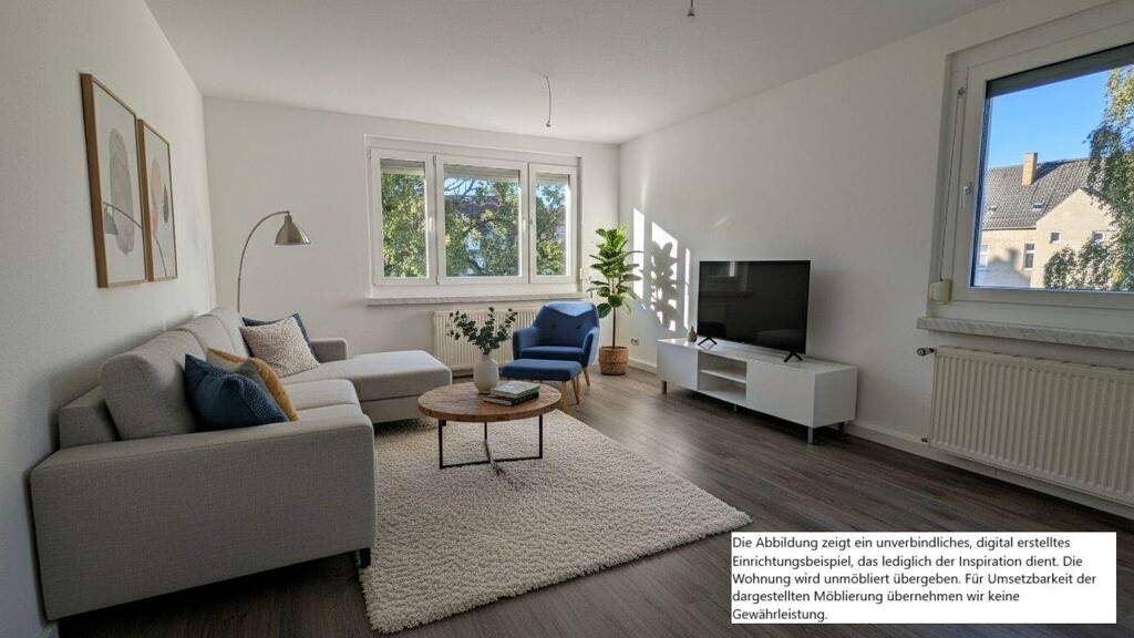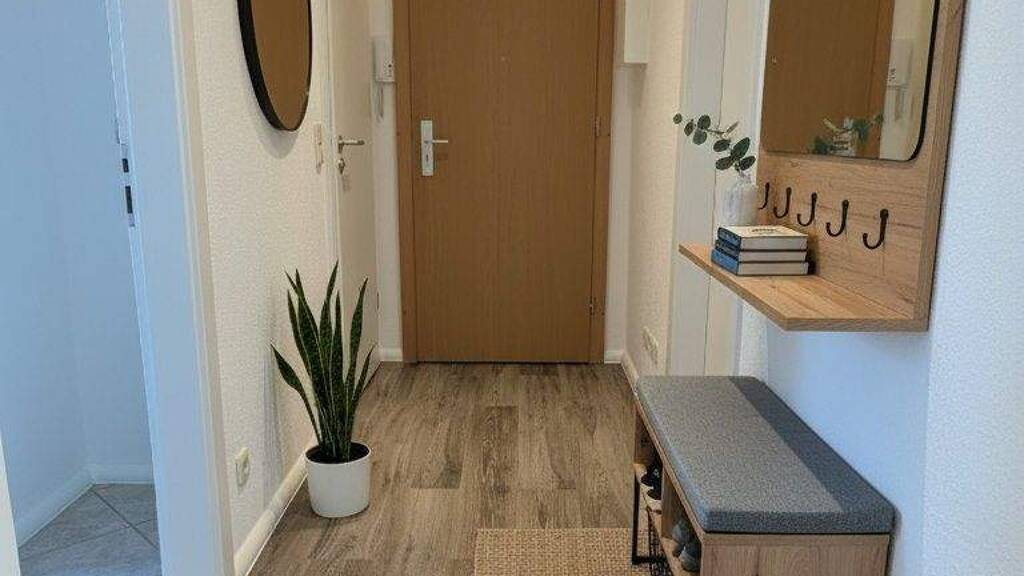 Über den Flur der Wohnung können das Wohnzimmer, das Kinderzimmer, die Küche und das Bad erreicht werden. Das Schlafzimmer wird über das Wohnzimmer begangen. Wohn- und Kinderzimmer sind an der Sonnenseite des Hauses.