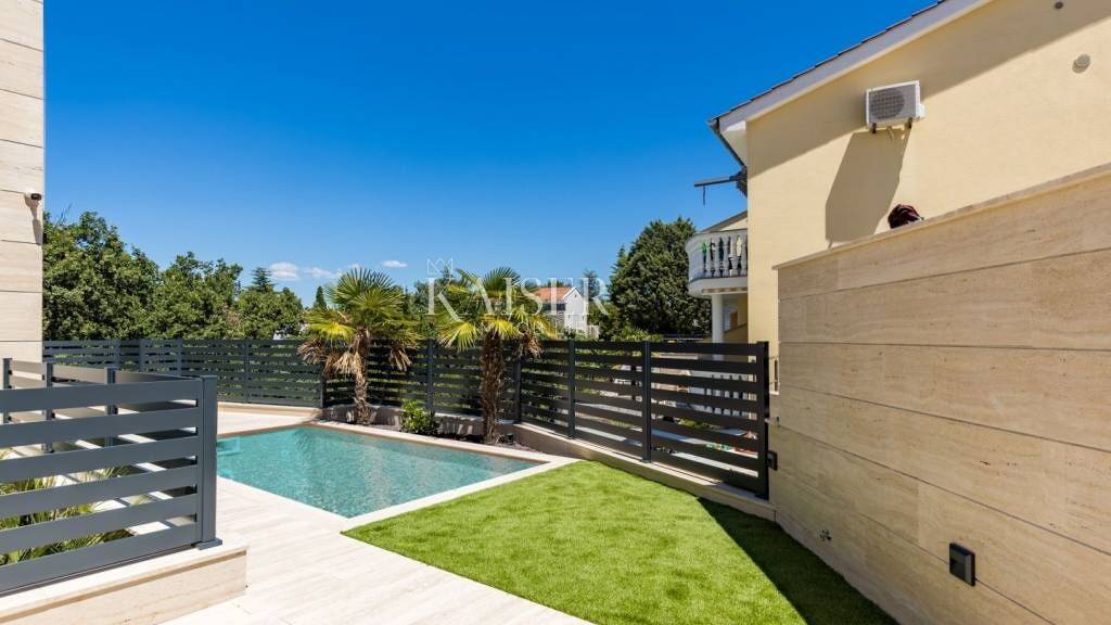 Kaiser Immobilien bietet ein Penthouse im zweiten Stock einer Luxusvilla, 80 Meter vom Meer entfernt. Die Villa wurde 2022 erbaut und beim Bau wurden hochwertigste Materialien und eine innovative Bauweise verwendet. Auf 126 m2 befinden sich 3 Schlafzimmer mit jeweils eigenem Bad, ein Gäste-WC und ein großes Wohnzimmer mit Küche. Die Wohnung hat auch eine große überdachte Terrasse von 26 m2 mit freiem Blick auf das Meer. Für den vollen Genuss gibt es auch einen großen privaten Garten von 50 m2 mit einem Swimmingpool und einem Garten. Beim Bau wurden die hochwertigsten Materialien verwendet, so dass die Wohnung selbst über eine hochwertige Ausstattung verfügt. Fußbodenheizung, Mitsubishi-Kühlsystem mit Brüstungseinheiten in jedem Raum. Die Böden sind mit Porzellankeramik bedeckt, während die Decken mit eingebauter Beleuchtung abgesenkt sind. Die Wohnung hat auch eine einbruchhemmende Tür des italienischen Herstellers Diera, während die restliche Tischlerei in der Wohnung aus Walnussholz besteht. Das Gebäude ist mit einer Alarmanlage und Überwachungskameras gesichert. Hervorzuheben ist, dass die Wohnung über einen eigenen Parkplatz und eine Ladestation für Elektrofahrzeuge verfügt. Was diese Villa abgesehen von ihrer Lage außergewöhnlich macht, ist, dass ihre Fassade aus dem lüftenden römischen Travertinstein besteht, der einst von den alten Römern verwendet wurde.