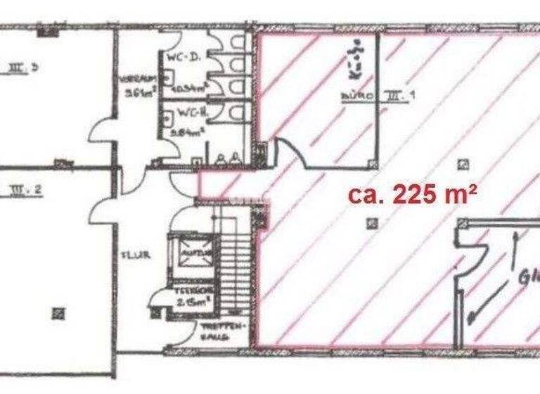 Einheit 2: ca. 225 m² ebenfalls im 2. Obergeschoss. In der Fläche liegt ein Teppichboden und eine Teeküche gehört zur weiteren Ausstattung.