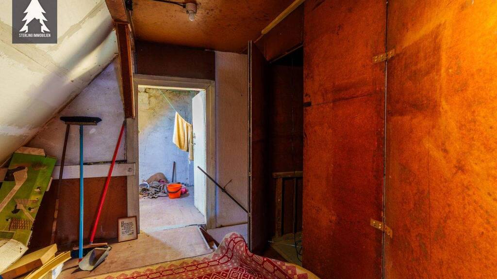 Das Nebengebäude war historisch teilweise auch schon wohnlich genutzt. Wir deklarieren es aktuell nicht als Wohnfläche, sehen aber Potenzial für individuelle Lösungen - insbesondere durch die sehr massiven, dicken Wände und die vorhandene Struktur. Im Erdgeschoss befinden sich zwei Flure, ein Raum, der früher als Zimmer genutzt wurde, sowie ein weiterer Raum, der zuletzt als Werkstatt diente. Zusätzlich gibt es hier ein separates WC in einem kleinen abgetrennten Bereich. Im Dachgeschoss liegt nochmals eine Art Zimmer (ebenfalls früher als Zimmer genutzt) sowie weitere Lagermöglichkeiten. Die Dachspitze ist über eine Leiter erreichbar und entspricht dem klassischen Dachboden.