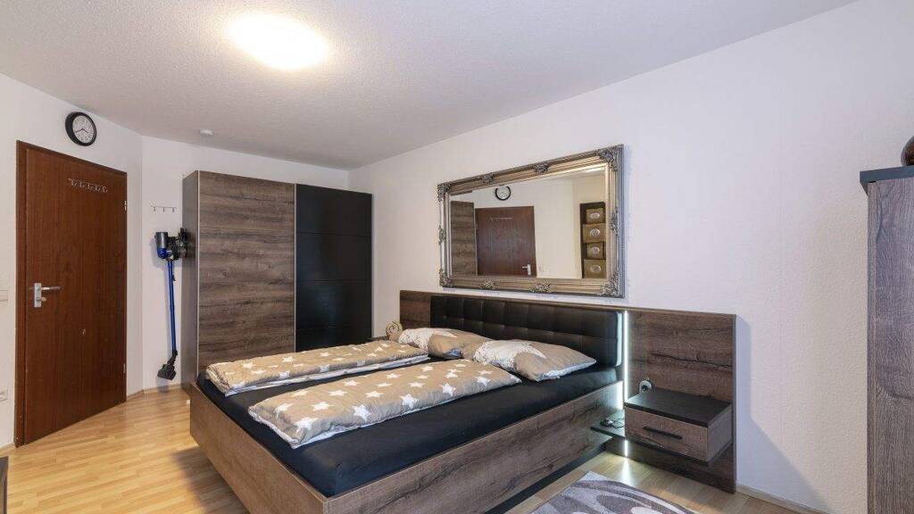 Schlafzimmer ist ausgestattet wie folgt: - Doppelbett 180 x 200 - Kleiderschrank - Schreibtisch - großer 55" Zoll Flachbildfernseher - Sideboard / Kommode - Spiegel, Regale und Ablagen - Zugang zum Balkon - Bettwäsche, Handtücher
