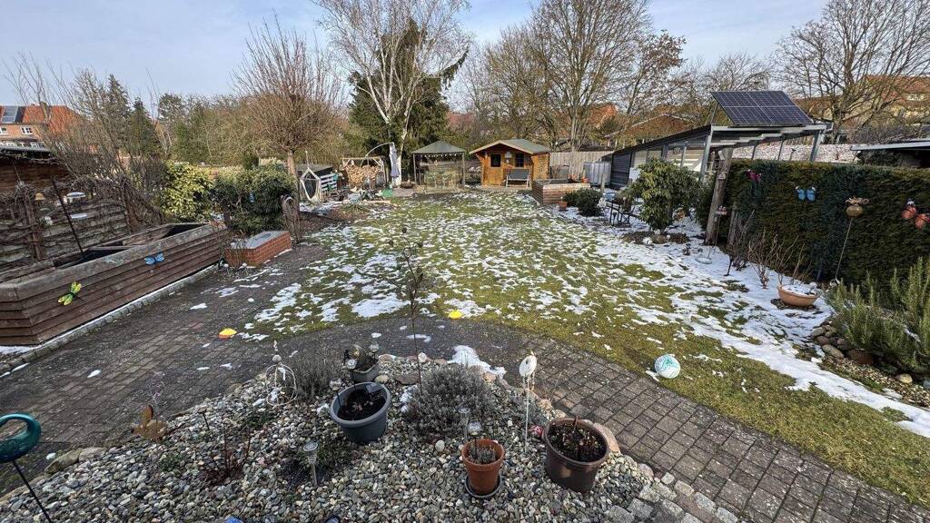 Die aktuelle Familie genießt schöne Abendstunden auf der im Jahr 2010 neu angelegten Terrasse mit Blick in den pflegeleicht gestalteten Garten. Hier finden Gartengeräte in einem Gartenhaus ausreichend Platz, sodass der Außenbereich funktional und zugleich angenehm nutzbar ist.