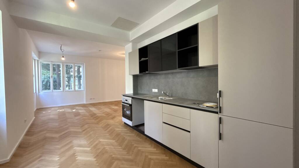 Der lichtdurchflutete Wohn- und Essbereich beeindruckt mit großen Kastenfenstern und schafft eine einladende Atmosphäre zum Entspannen und Wohlfühlen. Highlight ist die hochwertige italienische Designküche, die mit modernsten Geräten ausgestattet ist und zum gemeinsamen Kochen einlädt.