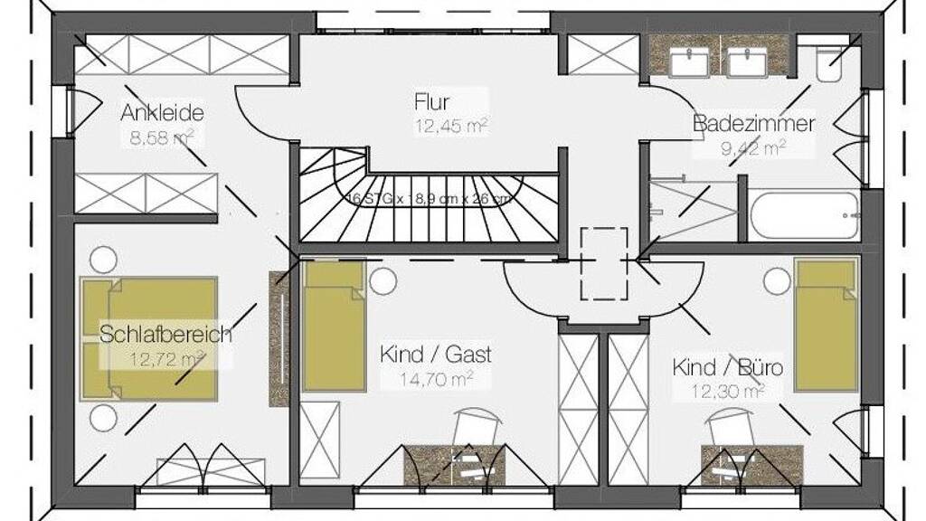 Das Obergeschoss dieses geräumigen Einfamilienhauses, ist architektonisch geprägt durch weitere Möglichkeiten der Variationsvielfalt. Ein großes Schlafzimmer mit Ankleidebereich und zwei weitere Zimmer stehen Ihnen auf dieser Etage zur Verfügung. Die Gestaltungsmöglichkeiten sind ganz auf Sie zugeschnitten. Das gut ausgestattete Fensterbad wird Sie begeistern. Mit großzügigem Duschbereich, zwei Waschbecken, Badewanne und ausreichend Platz, starten Sie gut in den Tag.