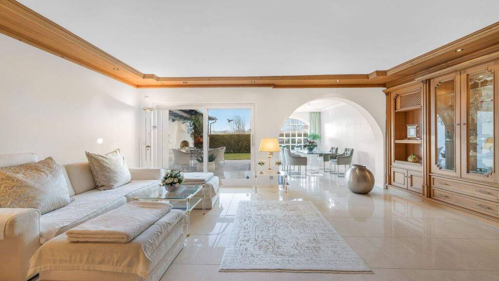 Bereits beim Betreten empfängt Sie ein repräsentatives Entree mit hellem Steinboden und stilvoller Offenheit. Von hier aus erschließt sich das Erdgeschoss mit seinem beeindruckenden Wohn- und Essbereich. Großzügige Fensterfronten, ein eleganter Rundbogen sowie maßgefertigte Schreinereinbauten verleihen diesem Raum eine besondere Atmosphäre. Die Fußbodenheizung im Wohn- und Essbereich sorgt für behaglichen Komfort, während der Blick ins eigene Grün ein Gefühl von Freiheit vermittelt.