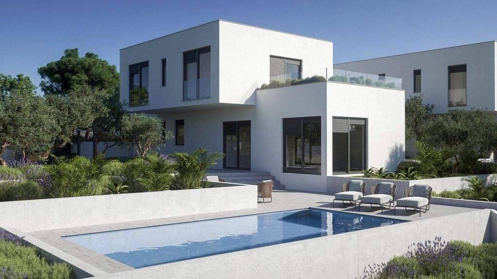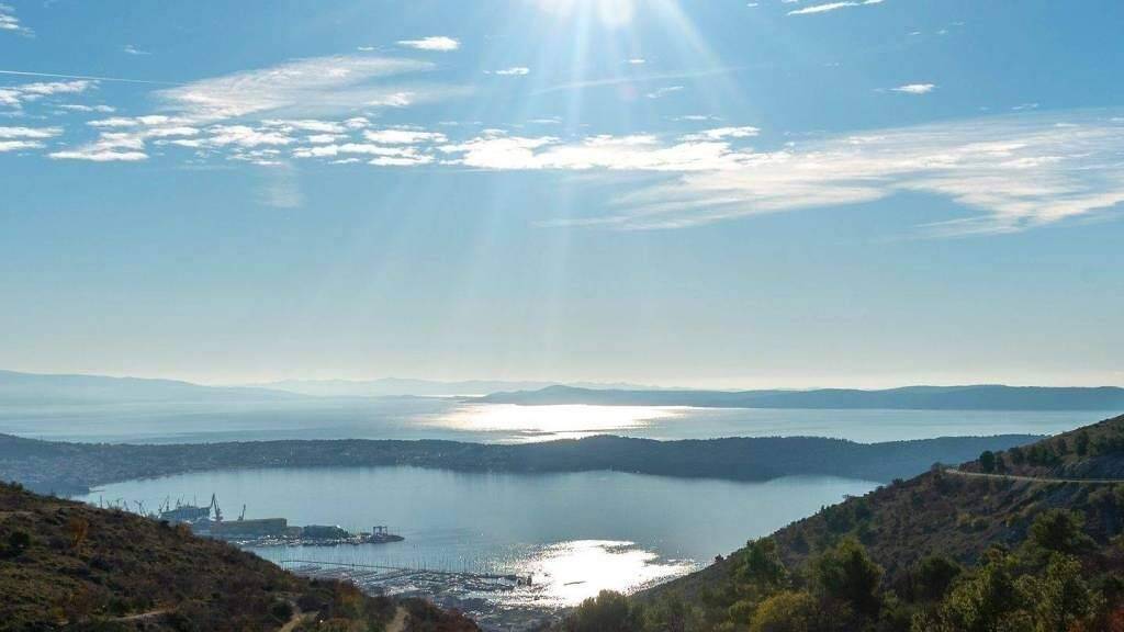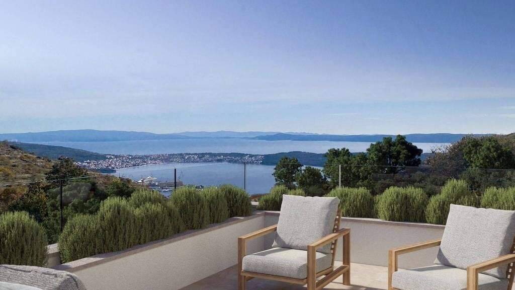 Luxusvilla mit Pool und Panoramablick auf das Meer und die Stadt Trogir, auf einem Hügel gelegen.