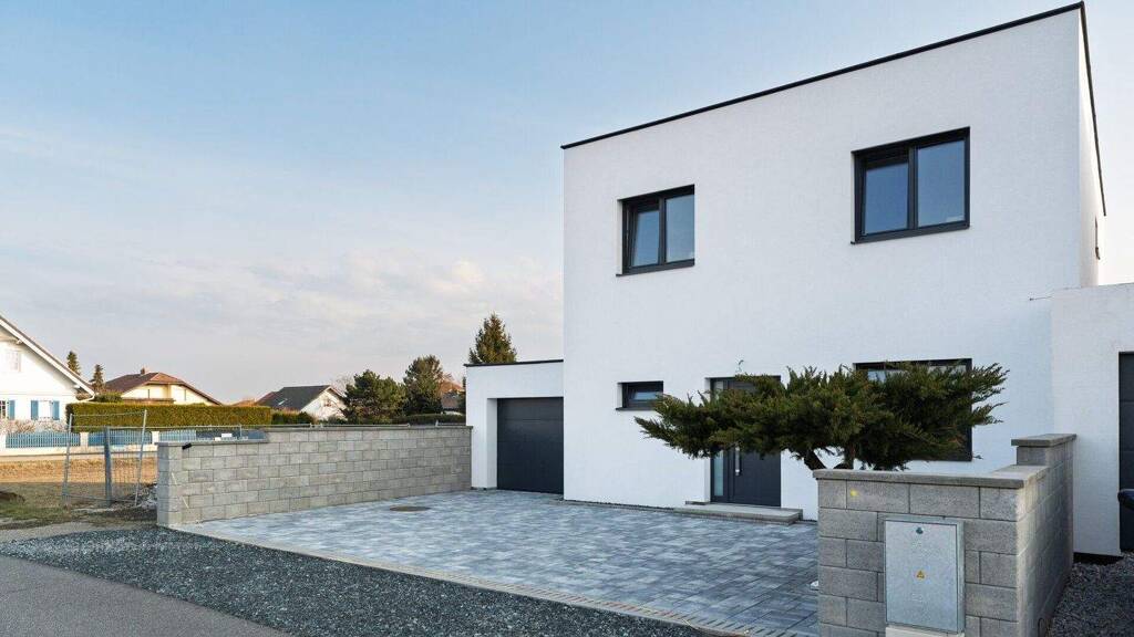 Dieses attraktive Einfamilienhaus wurde 2024-2026 gebaut und befindet sich in ruhiger Wohnlage am Rande von Theresienfeld mit Fernblick.