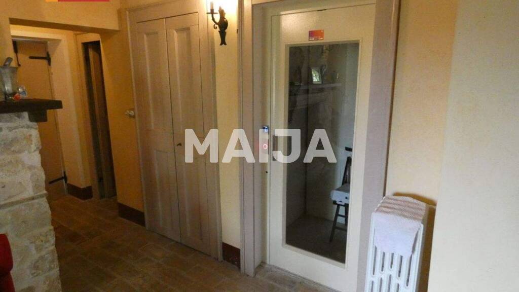 Die beiden Stockwerke sind über eine mit alten Fliesen bedeckte Treppe durch einen modernen Innenaufzug mit Glastür miteinander verbunden. Neues Gebäude im Bauernhausstil im Backsteinblock