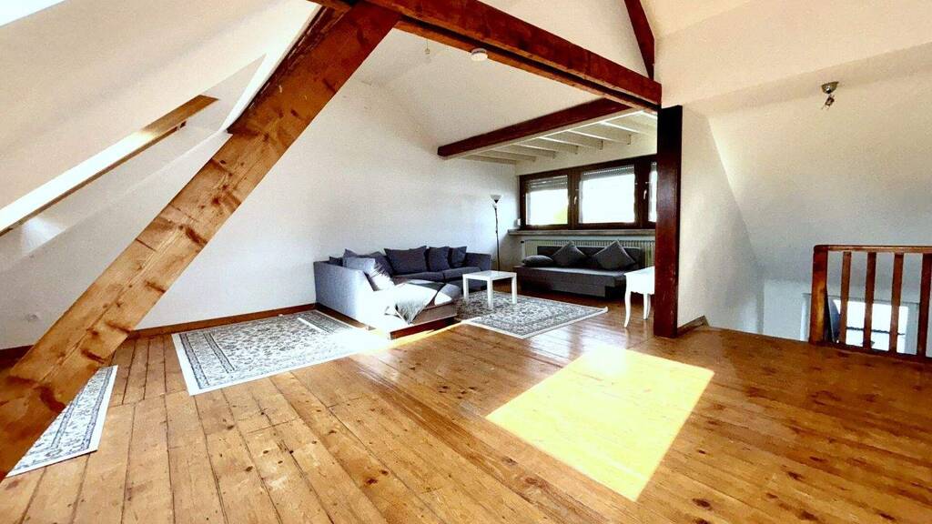 Das Herzstück dieser Wohnung ist zweifellos der große Wohnraum im Dachgeschoss. Die freiliegenden Holzbalken verleihen dem Raum einen warmen Charakter und vermitteln viel Gemütlichkeit. Ein Ort zum Entspannen und Abschalten. Im Eingangsbereich, in der Küche und im Dachgeschoss befinden sich Echtholzböden aus alten Schiffsdielen. Ansonsten wurde Vinylboden in Holzoptik verlegt. Der Raum zur Dachterrasse hat Marmorfliesen. Alle Räume sind lichtdurchflutet, sodass man sich sofort wohlfühlt.